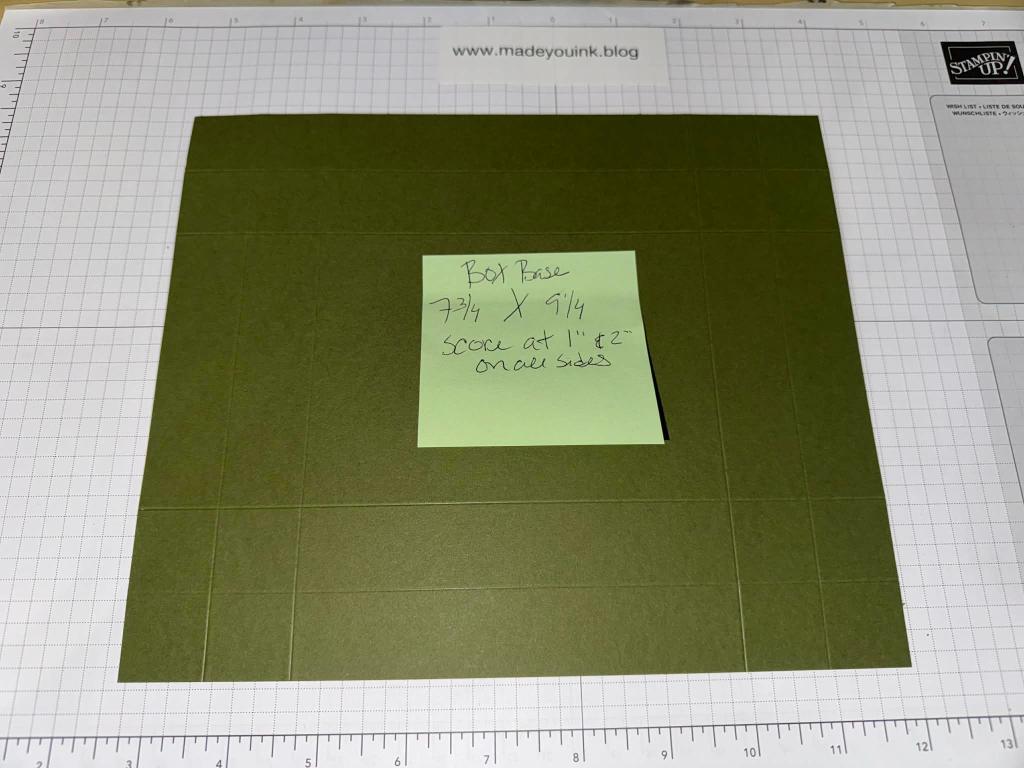 Box Base is Cardstock cut to 7 3/4″ X 9 1/4″. Then you’re going to score all four sides at 1′ AND 2″. Like so: