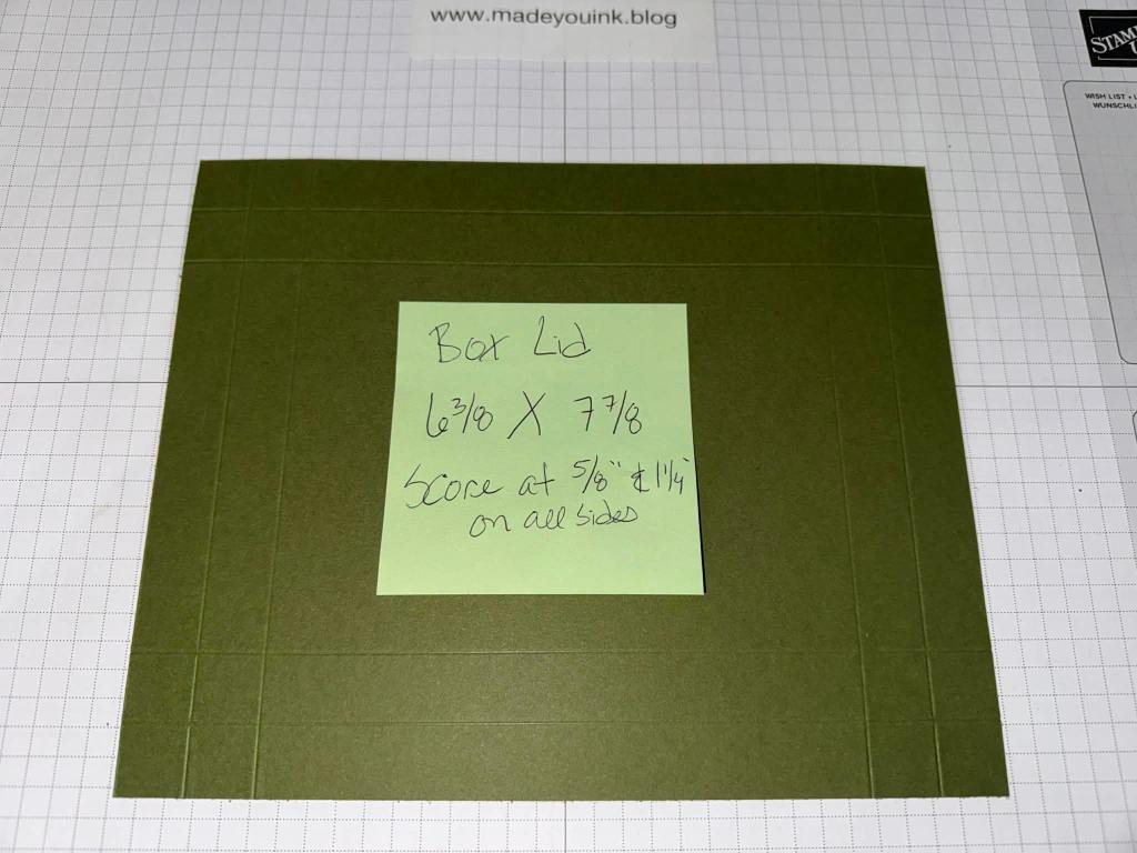 The Box Lid is pretty much the same except for the measurements. Cut your Cardstock to 6 3/8 X 7 7/8. Score all four sides and 5/8″ AND 1 1/4″