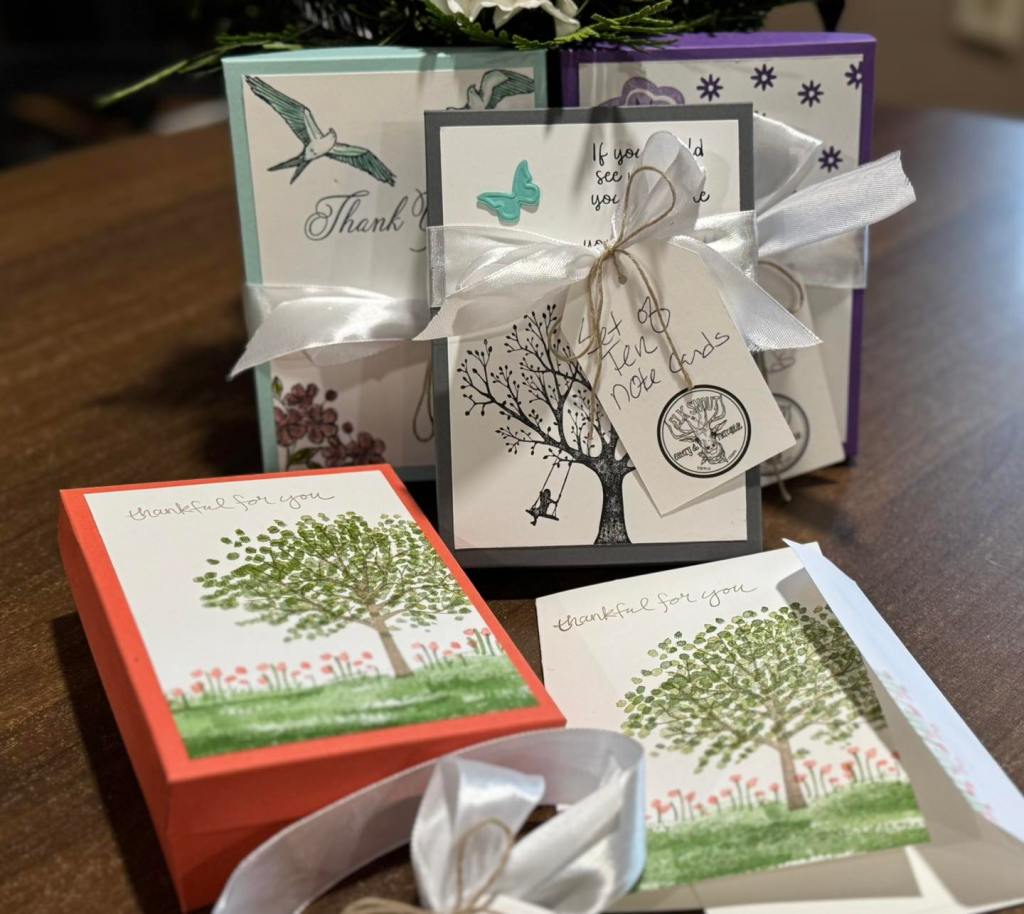 I’m so glad you asked! One of my new favorite things to make is these adorable little note card sets in a box….so fast and easy and make an adorable gift! And I mostly keep them single layer so the price point is awesome! Here’s some others I’ve done. Instructions on how to make the boxes are below 🙂